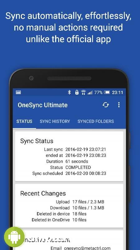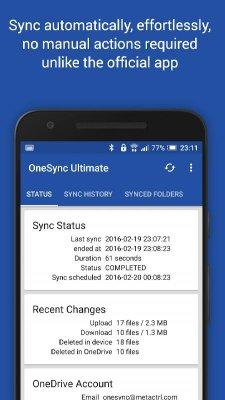 OneSync: Autosync for OneDrive - приложение для комфортного, функционального и более быстрого взаимодействия с облачным хранилищем от Microsoft с помощью мобильных гаджетов. Автоматизация действий по синхронизации и выгрузке файлов обеспечивает оперативное достижение поставленных перед собой задач. Есть и триггеры плюс таймеры. Что гарантирует построение структуры с оптимальным режимом работы. Есть и масса дополнительных особенностей и качеств. Что так же пригодятся для пользователей взявших на вооружение представленное ПО. Что в купе с системой защиты от посторонних действий и делает программу отличным приобретением.