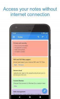 Private Notepad - safe notes - блокнот обладающий обширным набором возможностей и функций, что позволят решить практически возможные задачи возникающие в бытовой и профессиональной сфере деятельности среднестатистического пользователя. Есть и система зашиты. Шифрование обеспечит сохранность данных и невозможность получения конфиденциальной информации, даже в случае контроля над самим устройством. В этом поможет механизм самоуничтожения. Разработчик серьёзно подошёл к проработке представленного ПО. Удобный процесс организации заметок, комфортность взаимодействия и прочие аспекты и качества так же в списке положительных черт.
