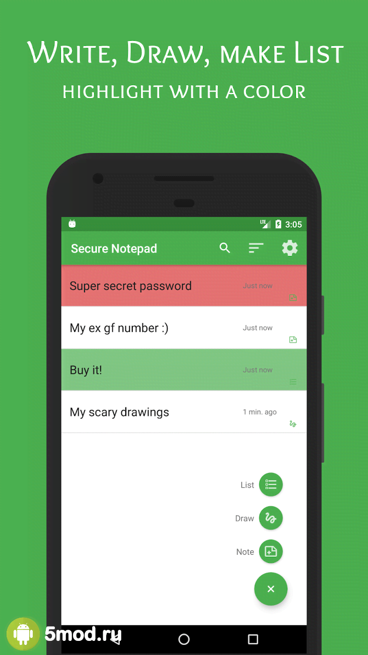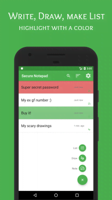 Secure Notepad - Private Notes With Lock - простой, но приятный в обращении блокнот. Самый стандартный блокнот с несколькими полезными функциями и возможностями. Самой важной из которых является наличие защиты. Никто кроме владельцев не сможет добраться до его содержимого. Быстрый запуск и автоматическое выключение обеспечивает высокую скорость работы, если нужно что-то срочно записать, сформулировать мысль, накидать идеи для предстоящего мозгового штурма и так далее. Можно и сохранять файлы отдельно, как резервную копию. Шифрование превратит их без этого приложения и пароля в несвязанный набор букв и цифр.