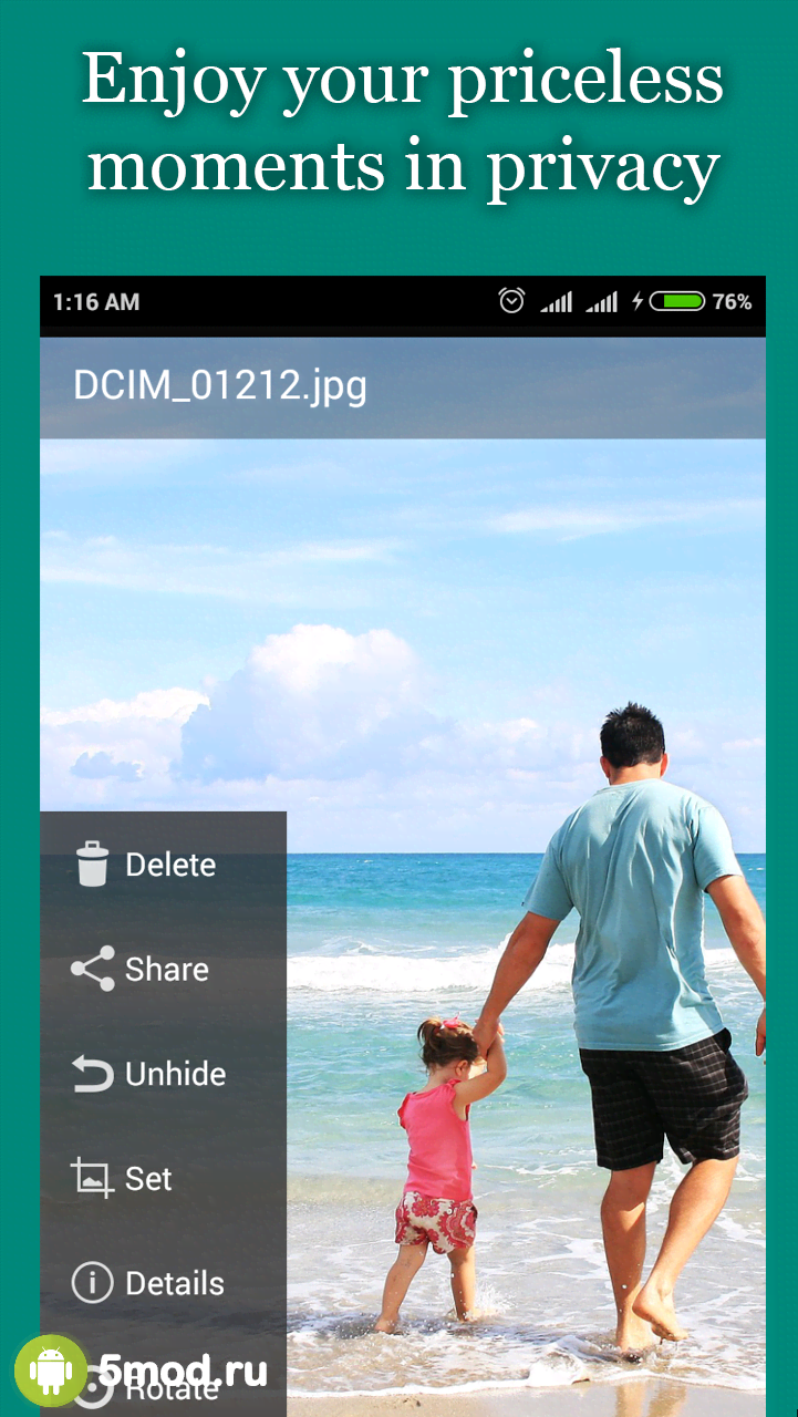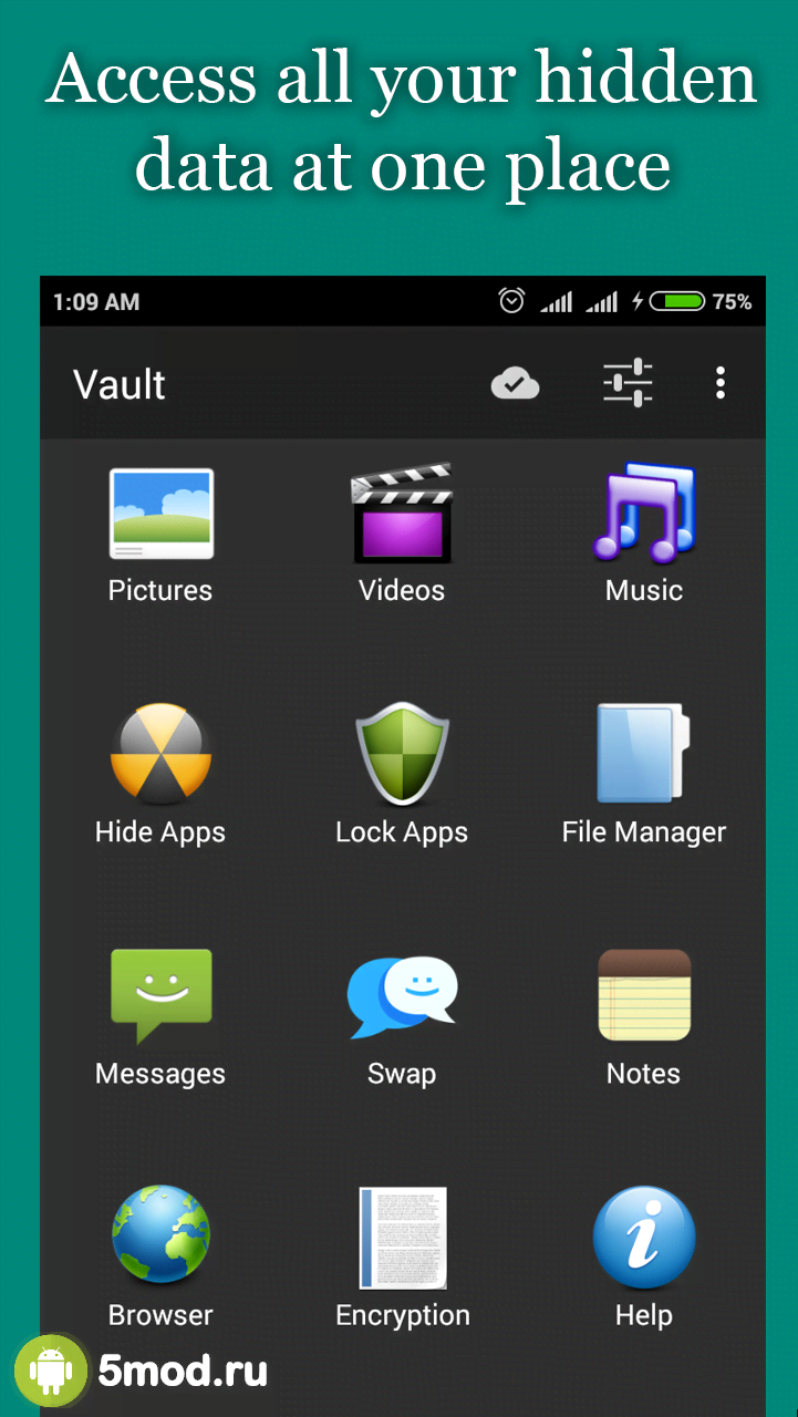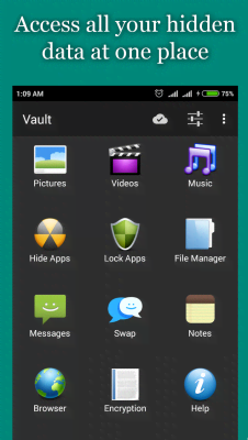 Hide Photos, Video-Hide it Pro - оригинально исполненное приложение предназначенное для сокрытия конфиденциальной информации для ситуаций когда устройство находится в общем доступе и появление каких-либо запароленных папок может вызвать ненужное подозрение. Данный проект маскируется под аудио приложение в котором можно выставлять значения громкости. Но при длительном нажатии на заголовке проявляется истинные свойства данной программы. Вводим пароль и получаем доступ ко всему содержимому секретной директории, которую никто не будет искать за обычным системным значком.