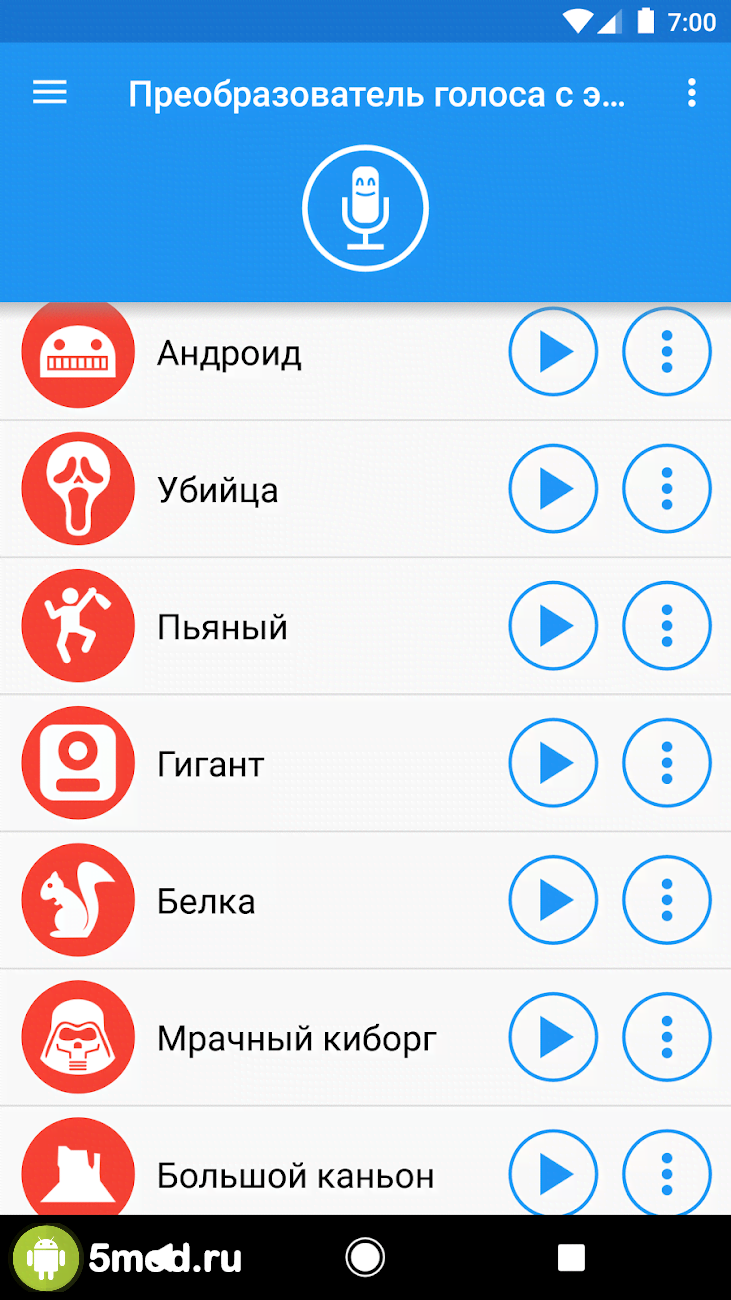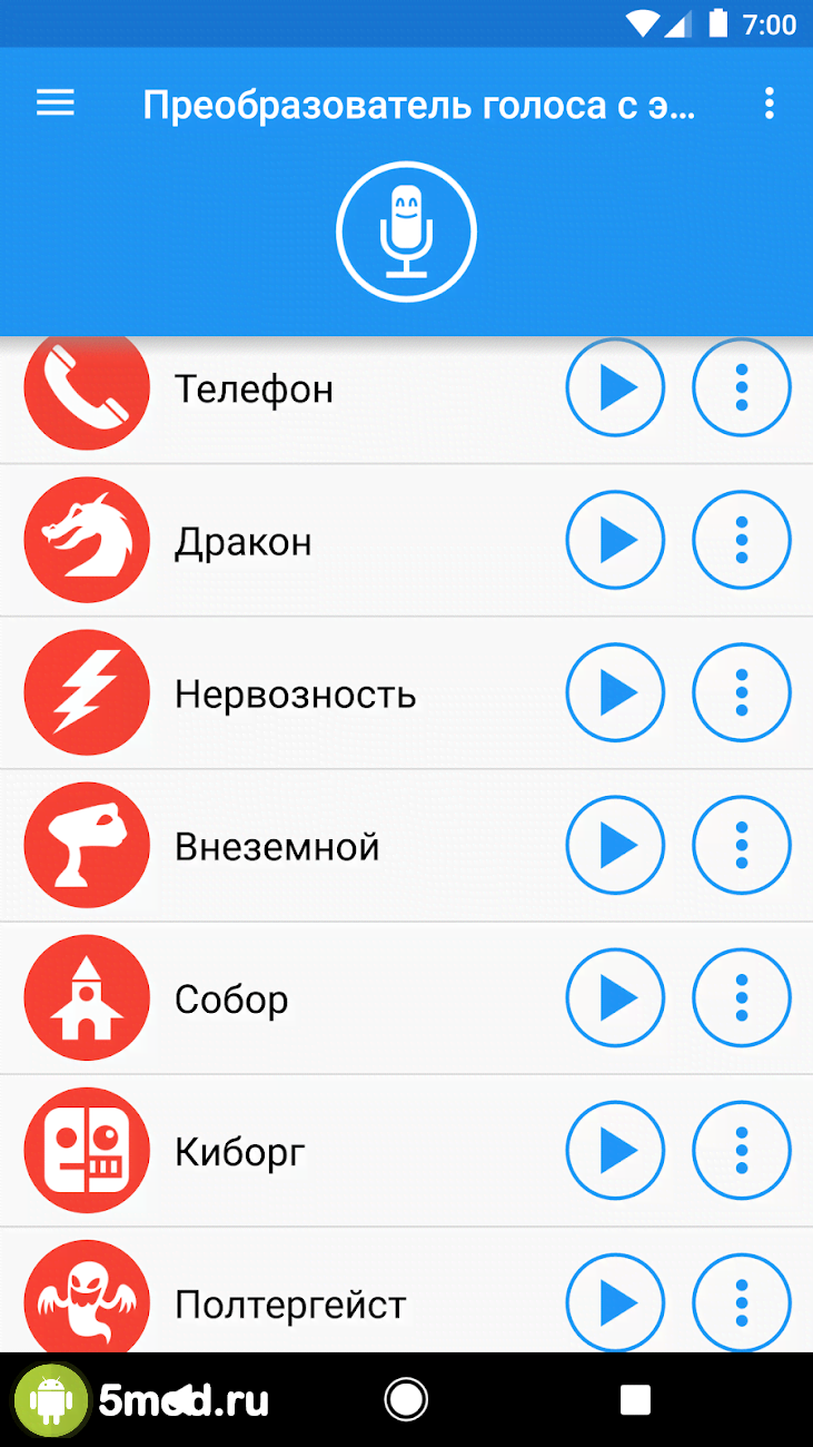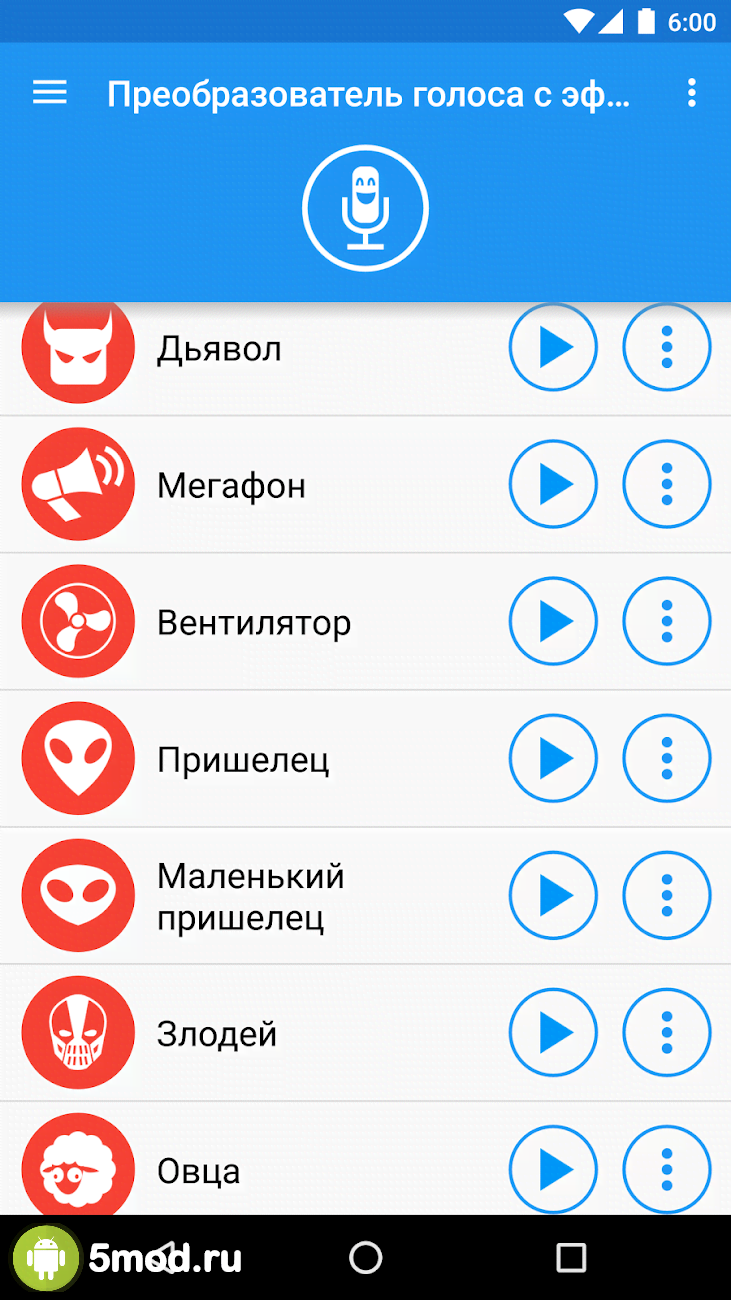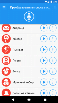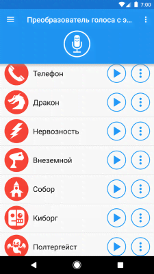 Voice changer with effects - развлекательно-увеселительный проект, что стал невероятно популярным способом исполнения шуток и розыгрышей. Пользователи могут изменять свой голос, вести запись и так далее. В их распоряжении внушительный спектр самых разных тональностей, что обладают понятными и легко ассоциирующимися названиями. Белка, киборг, привидение, инопланетянин, злодей и многие, многие другие. Приятный и стильный дизайн, удобное управление, сохранение записей, как аудио, так и с видео, импорт-экспорт, отправка и всё другое в списке возможностей и полезных особенностей.