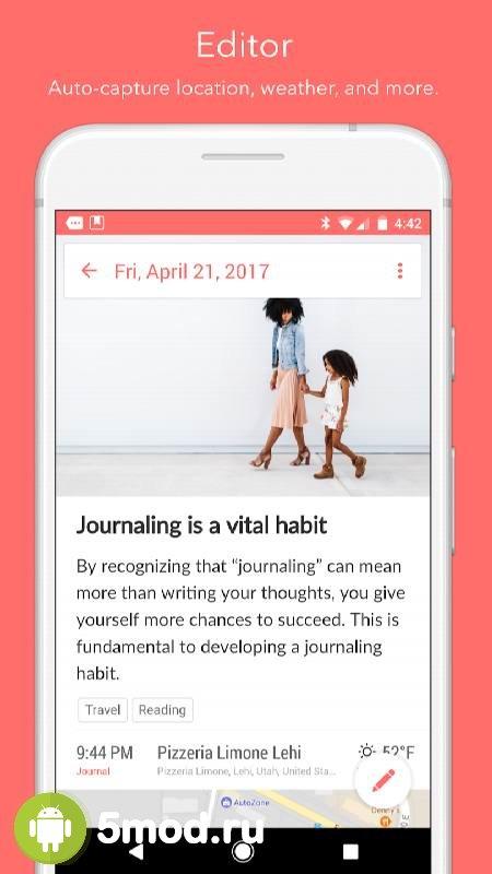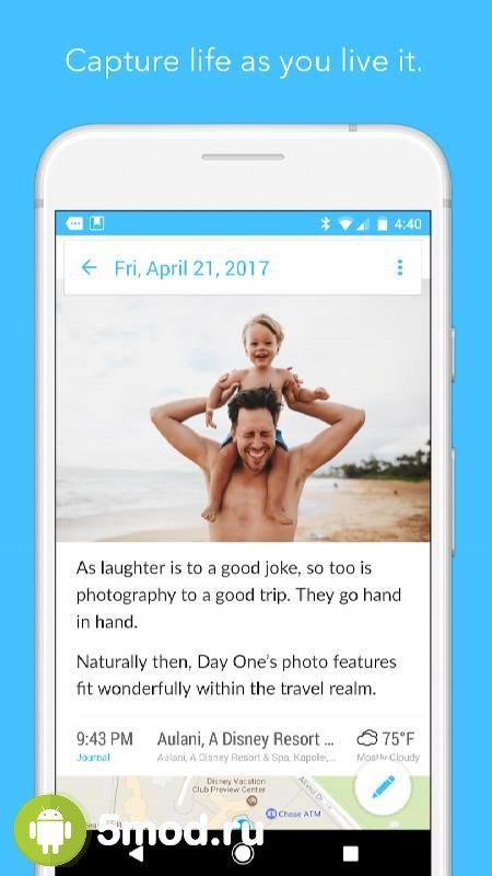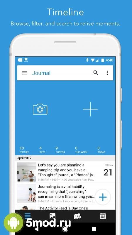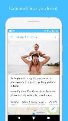 Day One Journal - приложение для пользователей, что обожают вести дневник. В данном случае они получают многофункциональную и очень комфортную в использовании структуру помогающую очень детально и развёрнуто переносить пережитые эмоции, возникшие идеи, мысли и всё прочее на цифровые страницы. Есть и возможность использовать ПО, как список дел на ближайшее время. Система напоминаний не позволит что-то пропустить, после чего придётся оставить разочарованный комментарий в своих записях. Универсальность, удобство, высокий уровень защищённости и многое другое делает программу отличной находкой.