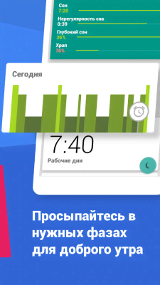 Для работы этой функции вам потребуется устройство с акселерометром. Во время сна телефон должен лежать рядом с вами на кровати. Когда вы шевелитесь, кровать прогибается и приложение фиксирует все изменения положения устройства, тем самым определяя фазу сна. Что касается будильника, то вас не ограничивают в их количестве. Можно выбирать день недели, время и прочие параметры. К интересным функциям можно отнести так называемую функцию «Вздремнуть», таймер, который устанавливается на 40 минут и после будит пользователя.