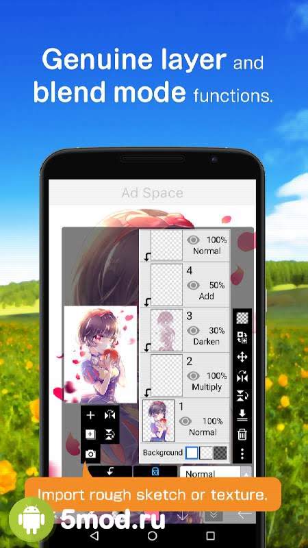 Функционал во многом сравним с настольными приложениями. Например, вы получите доступ к более чем 380 видам реалистичных кистей, сможете настроить толщину, начало и конец линии, прозрачность и многое другое. Свыше 2500 материалов, которые включат в себя монотонные цвета, японские фоны, наклейки, абстракции и многое другое, что можно использовать совершенно бесплатно. Десятки фильтров, выставление тона экрана, инструменты разделения, линейка, трансформация объектов, добавление текста и прочее, что может понадобится при редактировании готового изображения.