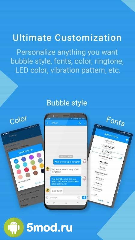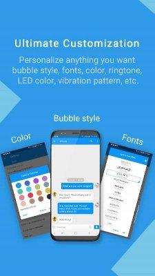 Handcent Next SMS-Text w/ MMS - отличная альтернатива стандартному ПО занимающемуся отправкой текстовых сообщений и картинок. Проект предлагает не только саму основополагающую функцию, но и огромные возможности по настройке всего рабочего процесса. От визуальной составляющей, до механики создания и переправки данных. Симпатичный вид, интересные решения, удобное управление, шифрование для безопасности и защищённости, поддержка умных часов и многое, многое другое и делает приложение весьма популярным выбором среди всех кто предпочитает более качественные и продуктивные программы на замену базовым.