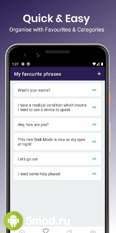 My Voice - Text To Speech (TTS) - приложение для произношения вслух набранного пользователем текста. Механика поддерживает более 30 языков, так что у большого количества людей появляется возможность существенно упростить взаимоотношения и переговоры в самых различных ситуациях, когда стандартный разговор не возможен. Кроме этого есть выбор между женским или мужским голосом, работа с диалектами, установка скорости звучания и многое другое. Ну, а библиотека заранее подготовленных фраз и предложений избавит от спешки и необходимости вводить всё заново или же спешно искать текстовые файлы на внутреннем пространстве.