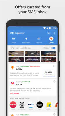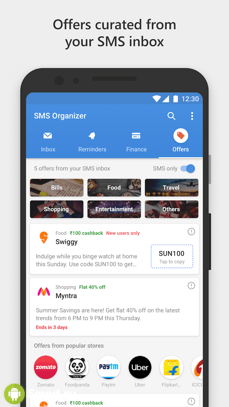 SMS Organizer - Clean, Reminders, Offers & Backup - отличная альтернатива привычному, но такому неудобному приложению для обмена СМС. Проект автоматически распределяет входящие по разным категориям, для того, чтобы пользователь всегда мог сосредоточиться на том что ему интересно и важно в данный момент. Так же приложение содержит в себе органайзер, что может существенно облегчить повседневную жизнь и работу любого кто так или иначе использует гаджет для оплаты, перемещения финансов, их отслеживания и так далее. Настройки, функции, инструменты и всё прочее порадует любого кто всегда сетовал на несовершенство стандартного ПО.