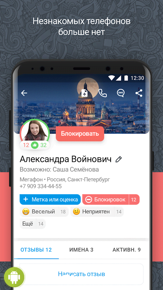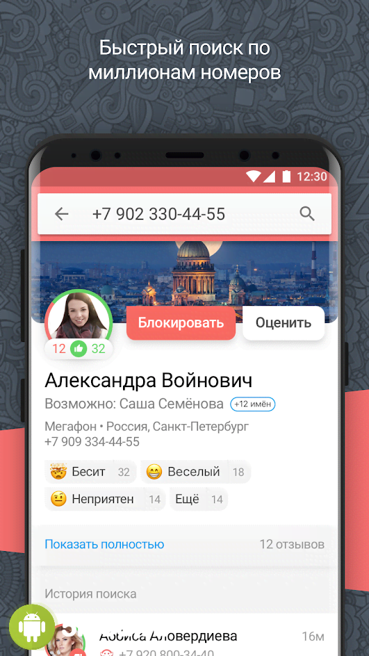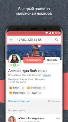 NumBuster определитель номеров - полезное приложение для тех кто очень небольшой поклонник общения с людьми звонящими с неизвестных номеров. Это всегда довольно неприятно, особенно в наши времена, когда мошенников, продавцов, спамеров, автоматических извещений и всех прочих проявлений современности столько, что это начинает раздражать. NumBuster проводит поиск входящего звонка или пришедшего СМС по глобальным базам данных и выводит предположительную информацию на экран отдельным виджетом. Описания в виде смайликов, блокировка и многое другое так же добавляет положительных впечатлений от продукта.