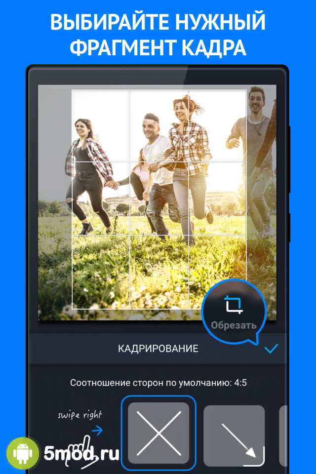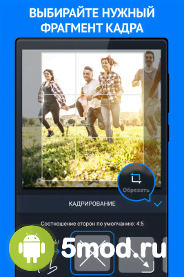 Процесс создания новых видеороликов не отнимет у вас много времени. Достаточно будет выбрать готовый ролик из галереи устройства и отправить его на редактирование. В главном меню располагаются все основные функции, а именно: поворот картинки, обрезание, добавление переходов, регулирование скорости, добавление стикеров, логотипов, текста и применение фильтров. Последних достаточно много и каждый можно настроить по-своему усмотрению, изменив яркость и насыщенность.