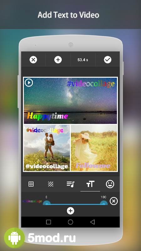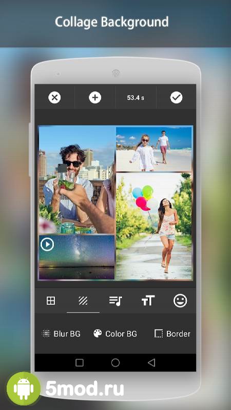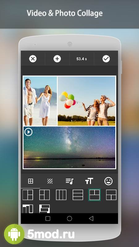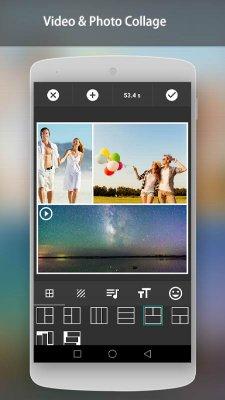 Video Collage Maker:Mix Videos - видеоредактор сосредоточенный на создании коллажей с комбинированной структурой. Зоны для материала могут заполняться и видеофайлами и фотографиями, что позволяет получать весьма оригинальные и зрелищные результаты. Наличие большого количества вариантов компоновки оставляет пользователям только необходимость выбора того материала, что будет использоваться в предстоящем проекте. При этом есть масса дополнительных функций, что сделают процесс по-настоящему творческим и приятным при реализации. Что и сделало программу очень популярной и востребованной у заинтересованных лиц.