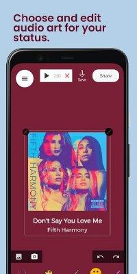 Audio Status Maker - редактор предлагающий поклонникам социальных сетей возможность собрать нужный им видеоряд поверх понравившегося музыкального трека или же его отрезка. Весь необходимый спектр инструментов и удобное использование им помогает выполнять всё тут же и без каких-то ошибок и промахов. Добавляя подгруженные собственные изображения и материалы к тем, что уже есть в коллекции. Есть и работа с текстом. Так что пользователи смогут оперативно создать небольшой шедевр и тут же выгрузить его в подходящую по формату соцсеть. Проект безусловно заслуживает внимание аудитории фанатов красиво оформленных страниц.