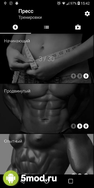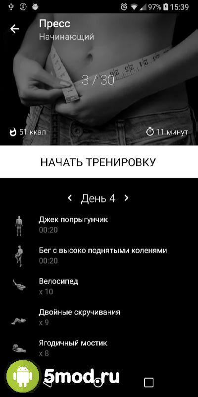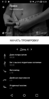 Six Pack in 30 Days (AxiomMobile) - приложение от известного разработчика. Уже фирменный и узнаваемый стиль интерфейса, большое разнообразие программ для работы над прессом в домашних условиях, инструкции и советы, составление статистики, выставление графиков для параллельных занятий, точный расчёт возможностей для пользователей тех или иных физических качеств, а так же многое другое делает представленный продукт очень привлекательным для аудитории. Желающим в самостоятельном режиме, без инструкторов и посещения фитнес-залов, получить желаемое обязательно стоит обратить внимание на подобную вариант.