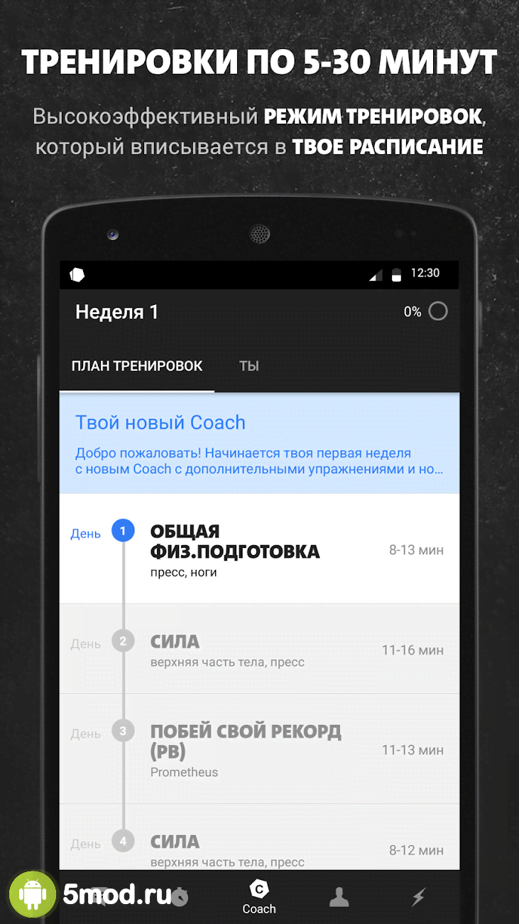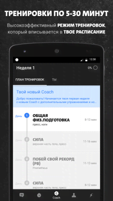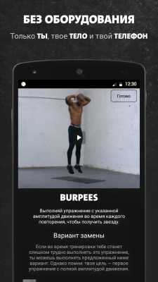 Freeletics: Personal Fitness Coach & Body Workouts - приложение предлагающее пользователям интенсивные фитнес-тренировки адаптированные к расписанию, уровню физической подготовки и целям человека решившего заняться самим собой. Занятия рассчитаны для 10-30 минут с упражнениями только с собственным весом, что избавляет от необходимости использовать возможности спортзала. 900 вариантов на все группы мышц, выбор интенсивности, количества и времени тренировок в неделю, советы, помощь и статистика делают данный вариант одним из самых популярных и действенным для самостоятельного применения.